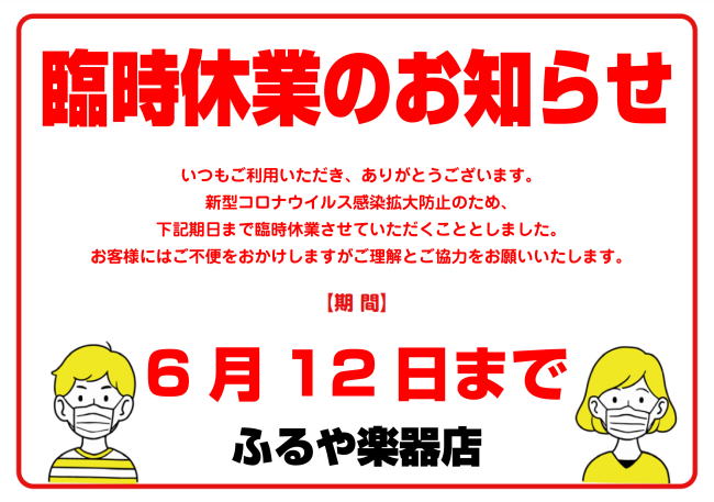 3月9日の専門家会議及3月10日の政府要請「10日程度の自粛延長」を重く受け止めふるや楽器音楽教室では、生徒様および講師スタッフの安全確保の観点から、レッスンの休講をさせていただくことといたしましたので、ご案内申し上げます。